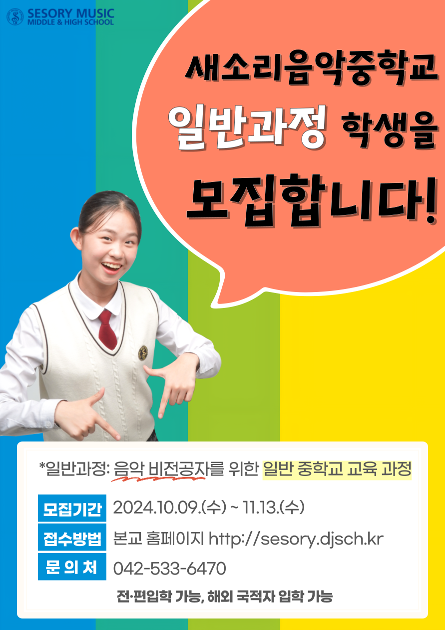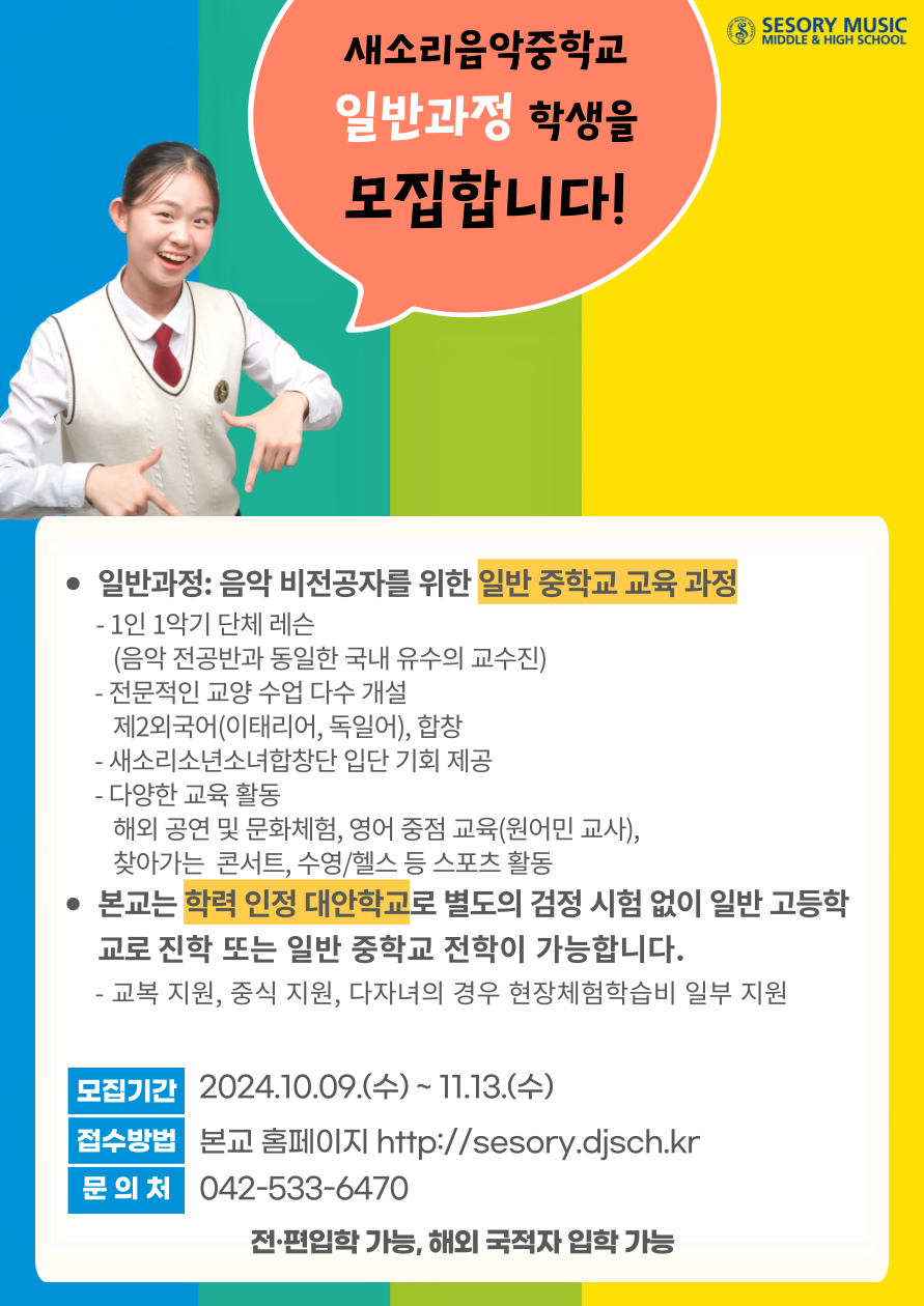 새소리음악중학교는 전통적 음악학교 체제(콘서바토리 제도)를 도입한 클래식 음악 전문 중, 고등학교입니다. 2025학년도부터 음악 비전공자를 위한 일반과정 학생을 모집합니다. (단, 중학교 과정에 한함) 가. 일반과정: 음악 비전공자를 위한 일반 중학교 교육 과정 1) 1인 1악기 단체 레슨 (음악 전공반과 동일한 국내 유수의 교수진) 2) 전문적인 교육 수업 다수 개설: 제 2외국어(이태리어, 독일어), 합창 3) 새소리소년소녀합창단 입단 기회 제공 4) 다양한 교육 활동: 해외 공연 및 문화체험, 영어 중점 교육(원어민 교사), 찾아가는 콘서트, 수영/헬스 등 스포츠 활동