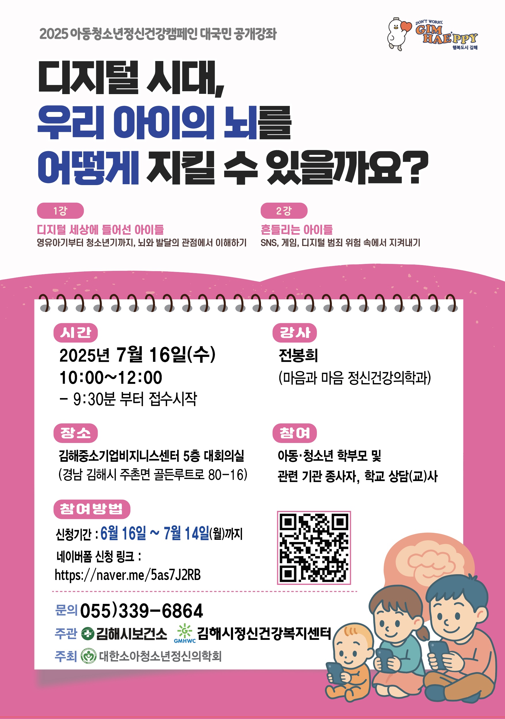 대한소아청소년정신건강의학회와 연계하여 진행하는 [2025년 대국민공개강좌]를 다음과 같이 안내합니다. 1. 일시: 2025. 7. 16.(수) 10:00 ~ 12:00 (2시간) 2. 장소: 김해중소기업비지니스센터 대회의실 5층(김해시 주촌면 골든루트로 80-16) 3. 강사: 전봉희원장(마음과마음 정신건강의학과 전문의) 4. 주제: 디지털 시대, 우리 아이의 뇌를 어떻게 지킬 수 있을까요? 5. 대상: 아동·청소년 학부모 및 학교상담(교)사, 교육복지사 등 200명 6. 신청기간: 2025. 6. 16.(월) ~ 7. 16.(수) 09:00까지 7. 신청방법: 네이버폼을 통한 신청(https://naver.me/5as7J2RB) 또는 전화(055-339-6864)